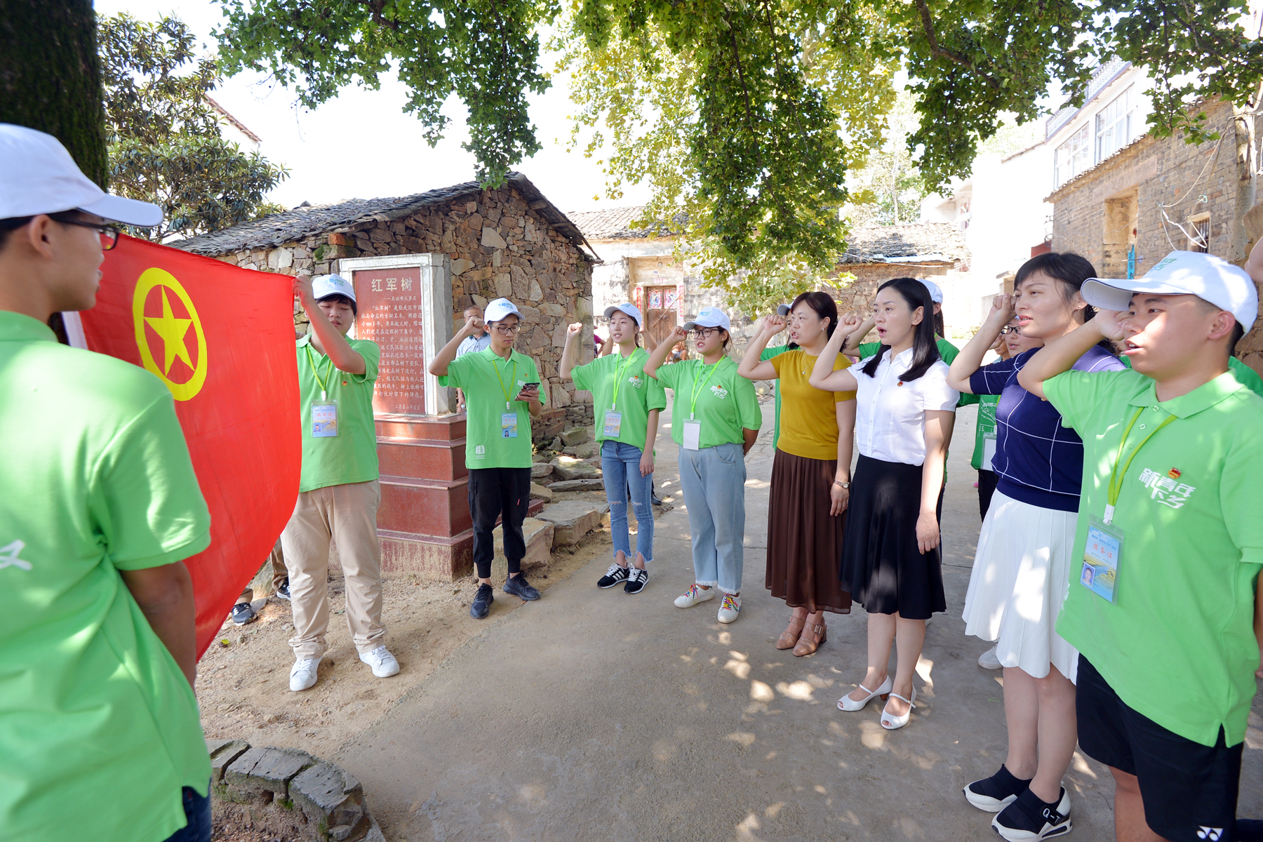 团市委叶文静书记、新洲区委常委叶霞、新洲区团区委书记张晓涵与我院新青年们一起在“红军树”下缅怀革命先烈的丰功伟绩,重温入团誓词,齐唱共青团歌。武汉市人社局张处长为在场学生讲解“红军树”的历史,我院刘桢老师讲述红军历史故事并朗诵诗歌《七律·长征》 。 我院分团委书记罗璇老师汇报了我校“新青年下乡”工作开展情况,叶文静书记为我校新青年们赠送了慰问物资,亲切询问“新青年们”下乡活动感受,听取学生们 “新青年”下乡日记的分享。