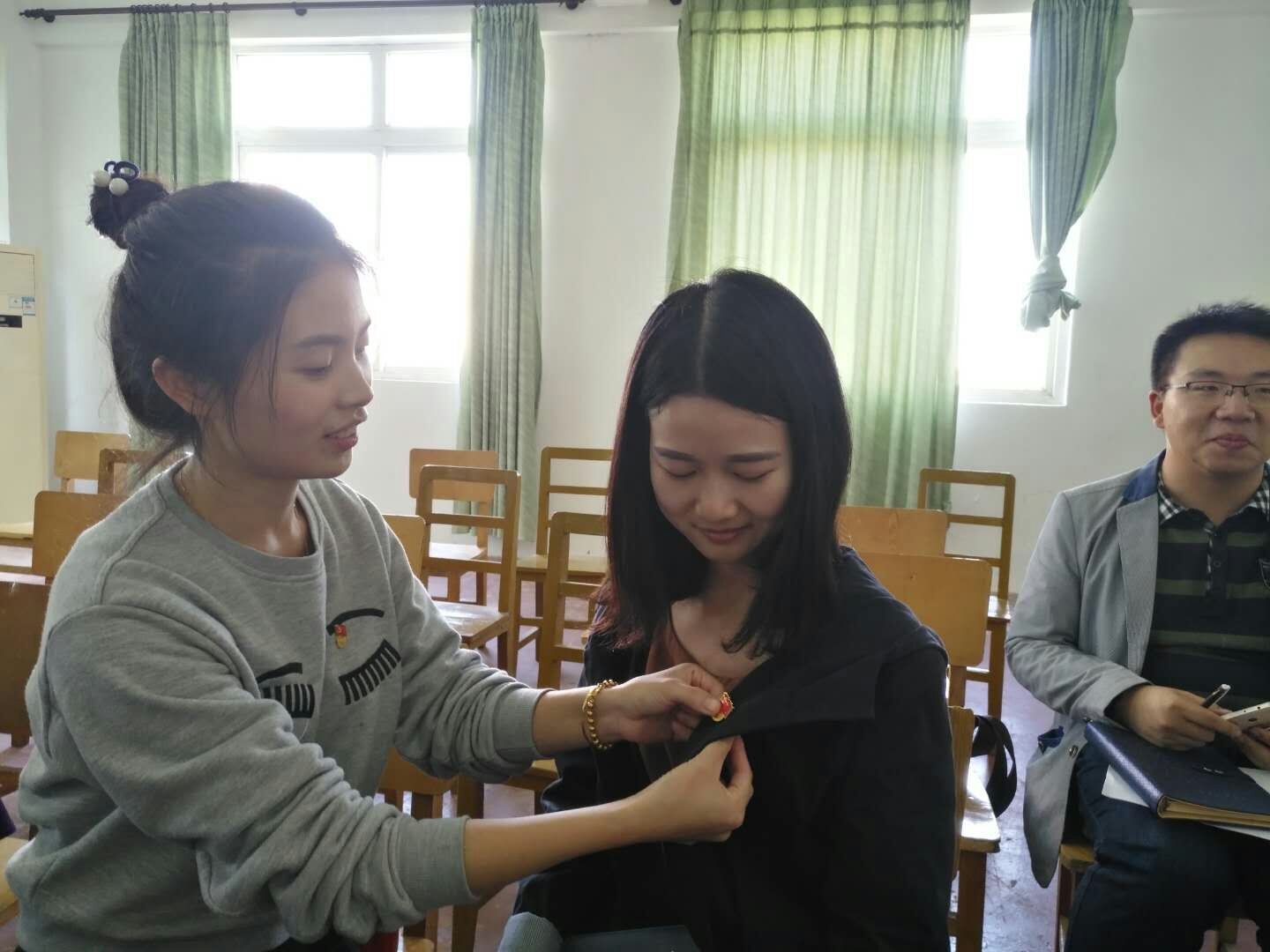 会议开始,全体党员教师领取并佩戴党徽,党总支书记要求党员参加活动必须佩戴党徽,彰显了对党崇高的敬意。