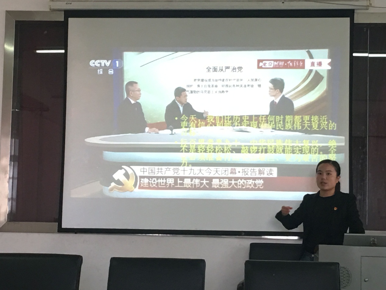 其次,我院辅导员张璐老师为全体党员教师进行了十九大会议的讲解和介绍。张璐老师从大会的主题入手,分析了十九大召开的重大使命,并且分别介绍了十九大报告中的六个“新思想”,把党的代表大会的历史和新时代的发展结合起来,将马克主义中国化的几个重要思想相结合,共同学习了十九大的重要变化。