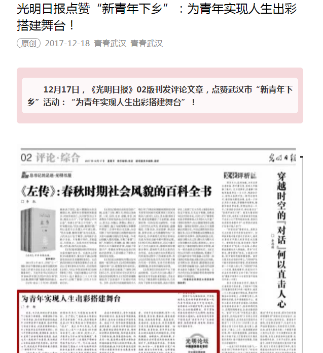 12月17日,中央媒体《光明日报》在02版刊发题为《为青年实现人生出彩搭建舞台》的评论员文章,点赞武汉市“新青年下乡”活动。黑瓜网每日大赛反差将进一步落实贯彻十九大精神,纵向深入推进新青年下乡,将十九大精神融入到学院改革发展工作中。