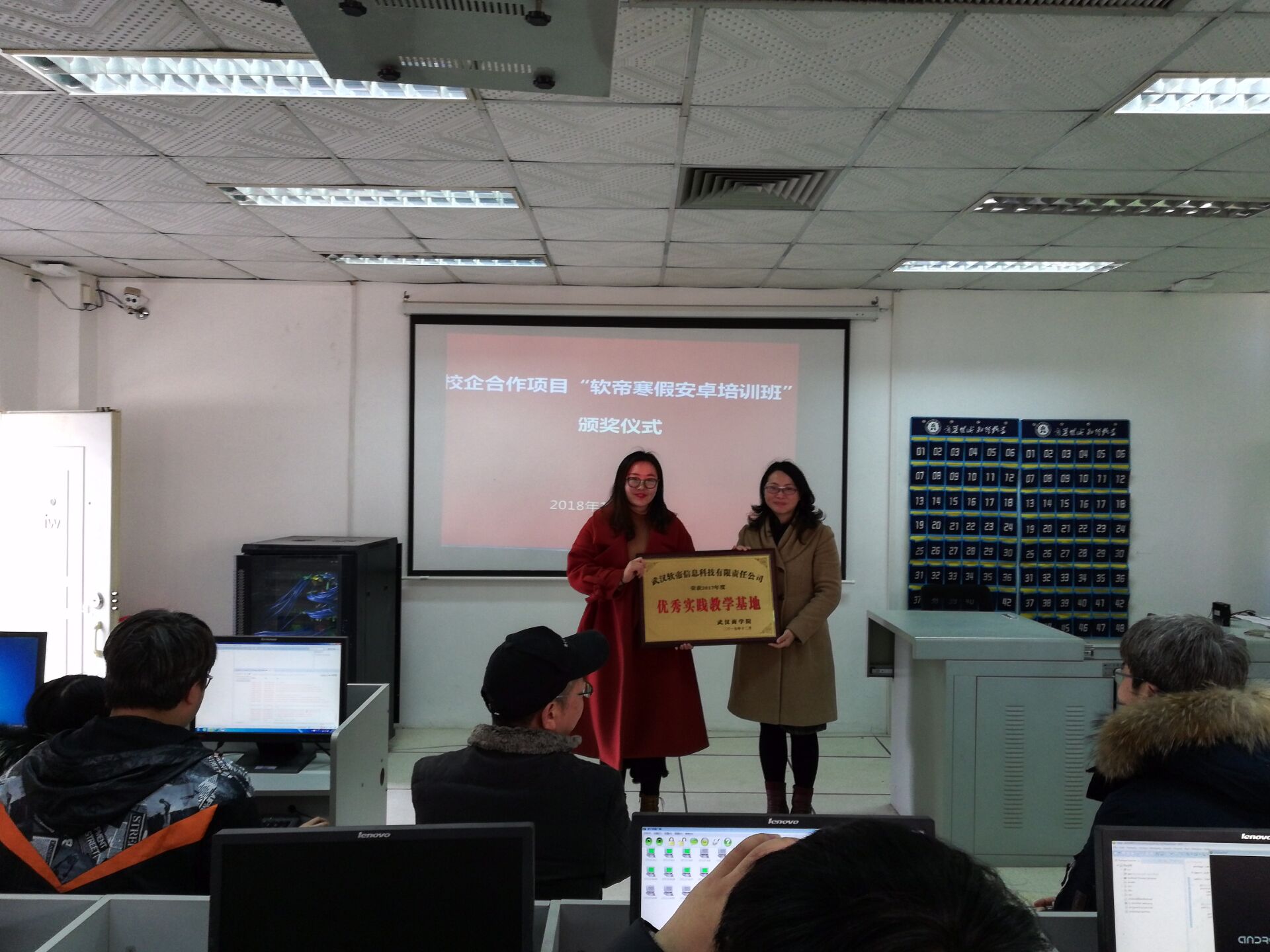 在颁奖活动中,武汉商学院教务处范青副处长为武汉商学院2017年度优秀校外实践教学基地武汉软帝信息科技有限责任公司童咪雪经理颁发奖牌。
