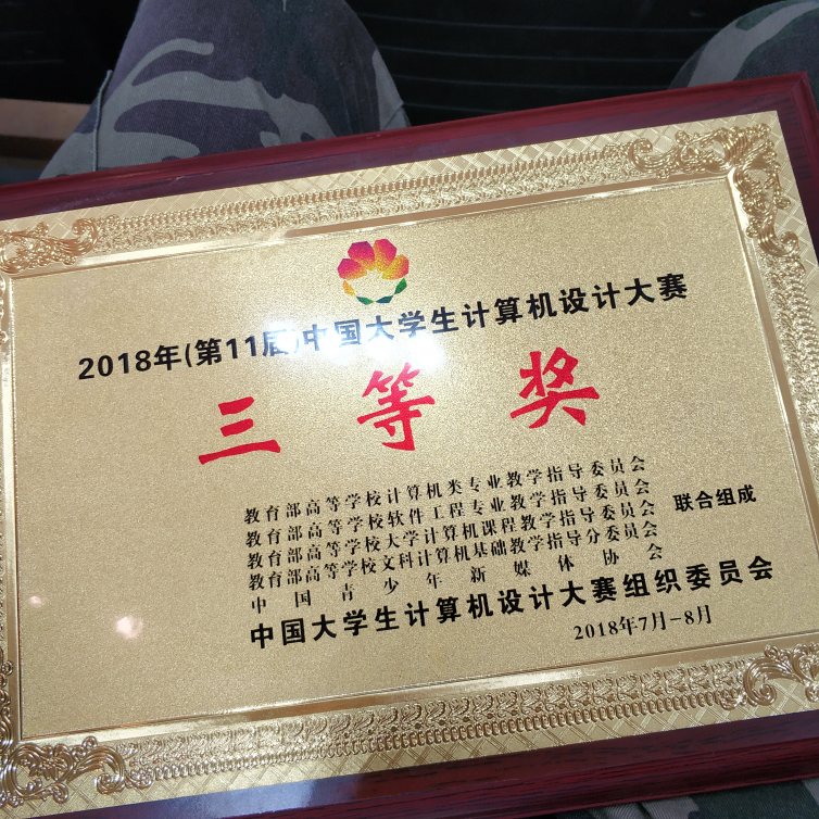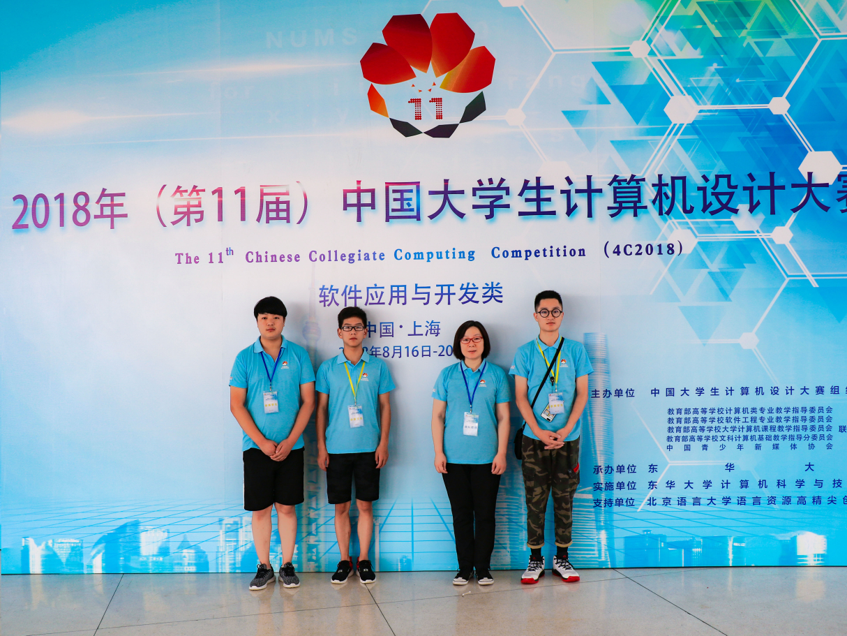 2018年8月16日,由张靖老师的带领下,飓风-Night队成员三名同学到达上海东华大学参加国赛,来到2018年(第11届)中国大学生计算机设计大赛软件应用与开发类决赛现场,在经过答辩后之后,他们的作品“智膳堂”智能厨房荣获2018年(第11届)中国大学生计算机设计大赛国家三等奖!