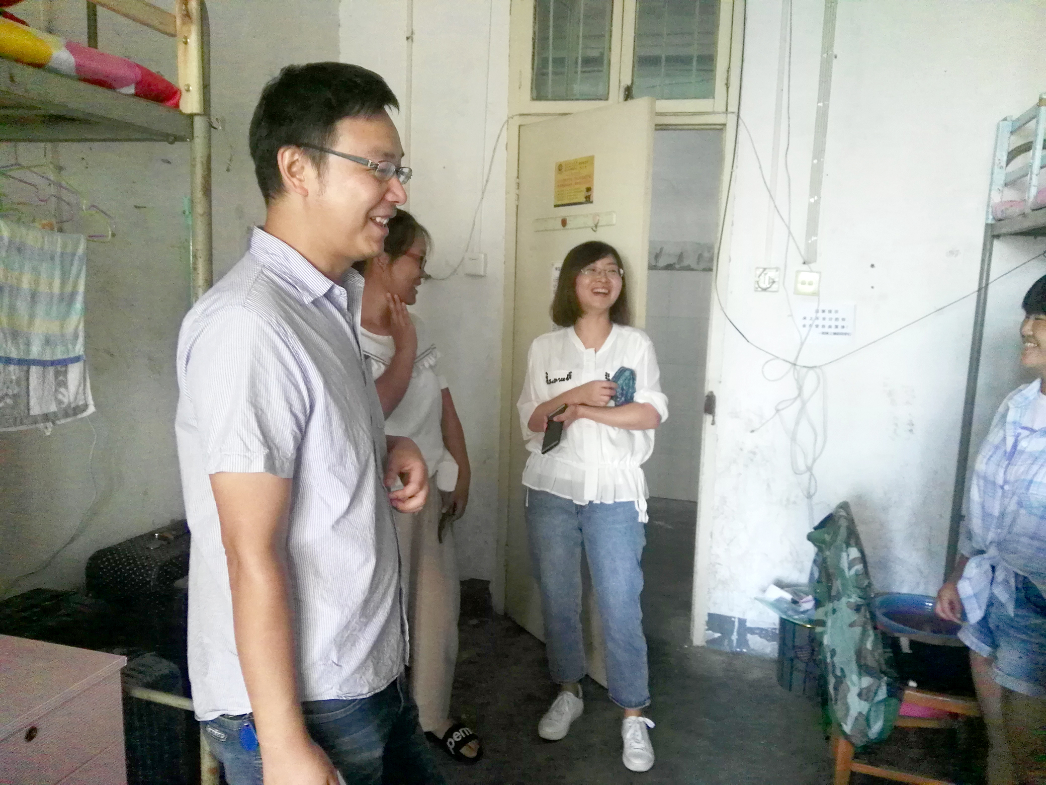 “你是来自哪里呀?”“在武汉生活还习惯吗?”“过节有什么打算?”“十一回不回家?”每走进一间学生寝室,老师们都详细询问新生们的情况,了解大家是否适应大学的新环境,现场气氛一片温馨。陈书记对同学们说道:“上大学后的第一个节日,虽然不在父母身边,但也有了老师和同学的陪伴,希望大家能够相互关心,相互帮助,勤奋学习,度过充实的大学生活。”熊老师建议大家利用假期调整好状态,预习今天刚刚领到的课本,做好节后上课准备,尽快适应大学学习。李老师则反复叮嘱同学们要注意安全,假期外出一定要结伴而行,不要晚归,注意妥善保管自己的贵重物品。