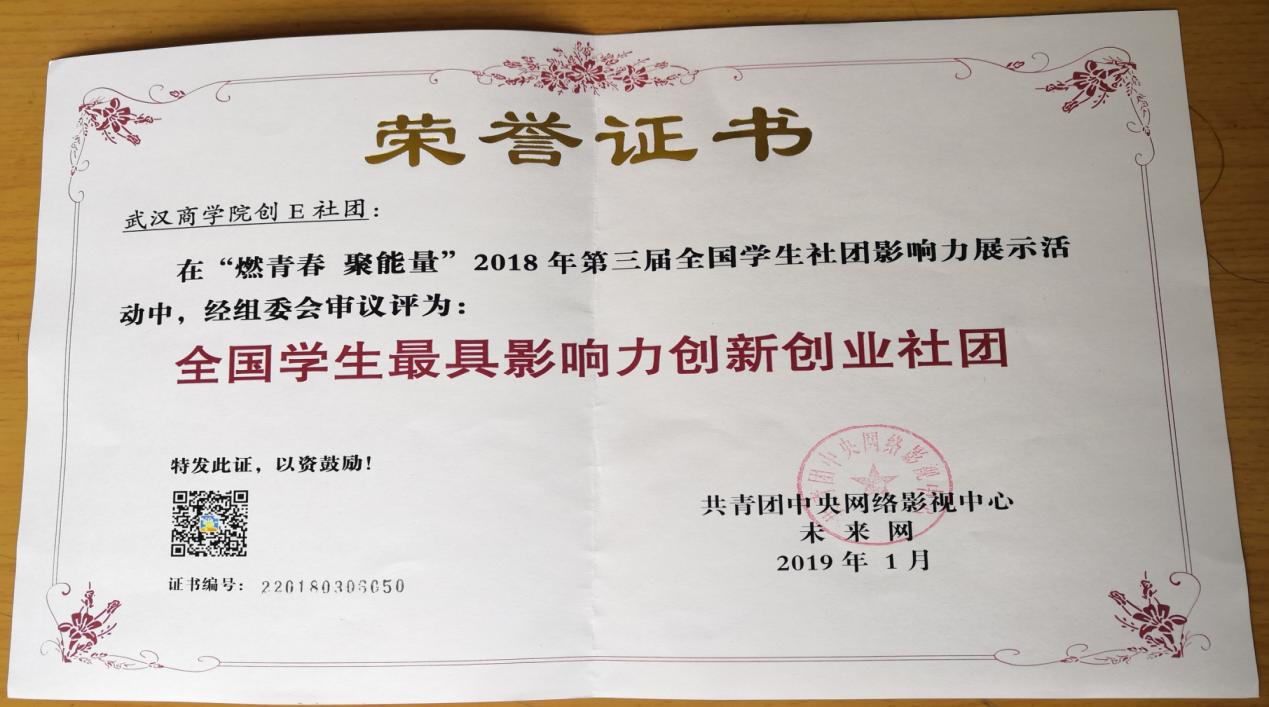 近日,武汉商学院创E社团在“燃青春聚能量”2018年第三届全国学生社团影响力展示活动中,被共青团中央网络影视中心评选为全国学生最具影响力创新创业社团荣誉称号。吉林大学、四川大学和东北大学等全国高校社团也获得此项荣誉。