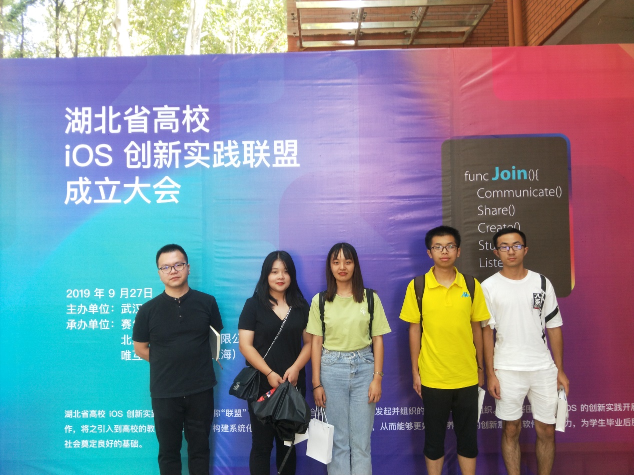 2019年9月27日,黑瓜网每日大赛反差杨成老师以及黑瓜网每日大赛反差张彤、梅燕尹、杨爽和樊庆元4名学生在武汉大学参加湖北省高校iOS创新实践联盟成立大会。