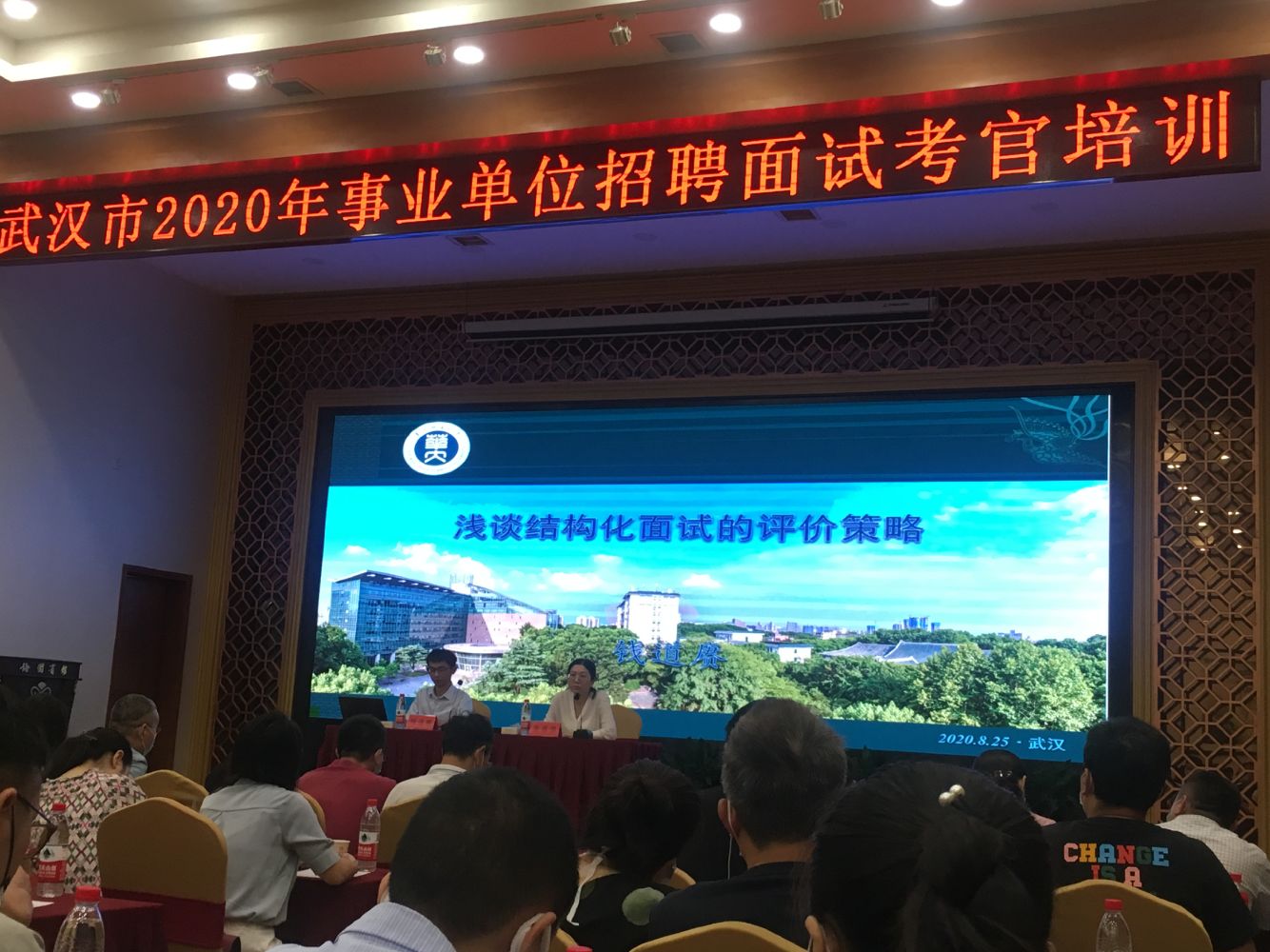 为了促进我院教师积极参与社会工作,积累社会工作经历,2020年8月25日,我院教师孔华峰、吴青林、毛卉、金振坤、黄晓、梅晓玲、王焱等7名教师参加了由武汉市事业单位公开招聘工作领导小组办公室举办的武汉市2020年事业单位招聘面试考官培训。培训分为两个环节,面试理论基础知识与流程规范和现场情景模拟。面试理论基础知识培训由富有经验的考官即华中师范大学考试研究院的钱道赓老师进行了详细的讲解,并从个人经验出发,阐述了面试考官应该具备的各种素养和能力。之后通过现场模拟面试展示结构化面试的流程以及考官的具体行为示范。我院7名教师圆满完成了培训任务,获得了事业单位公开招聘面试的考官证。
