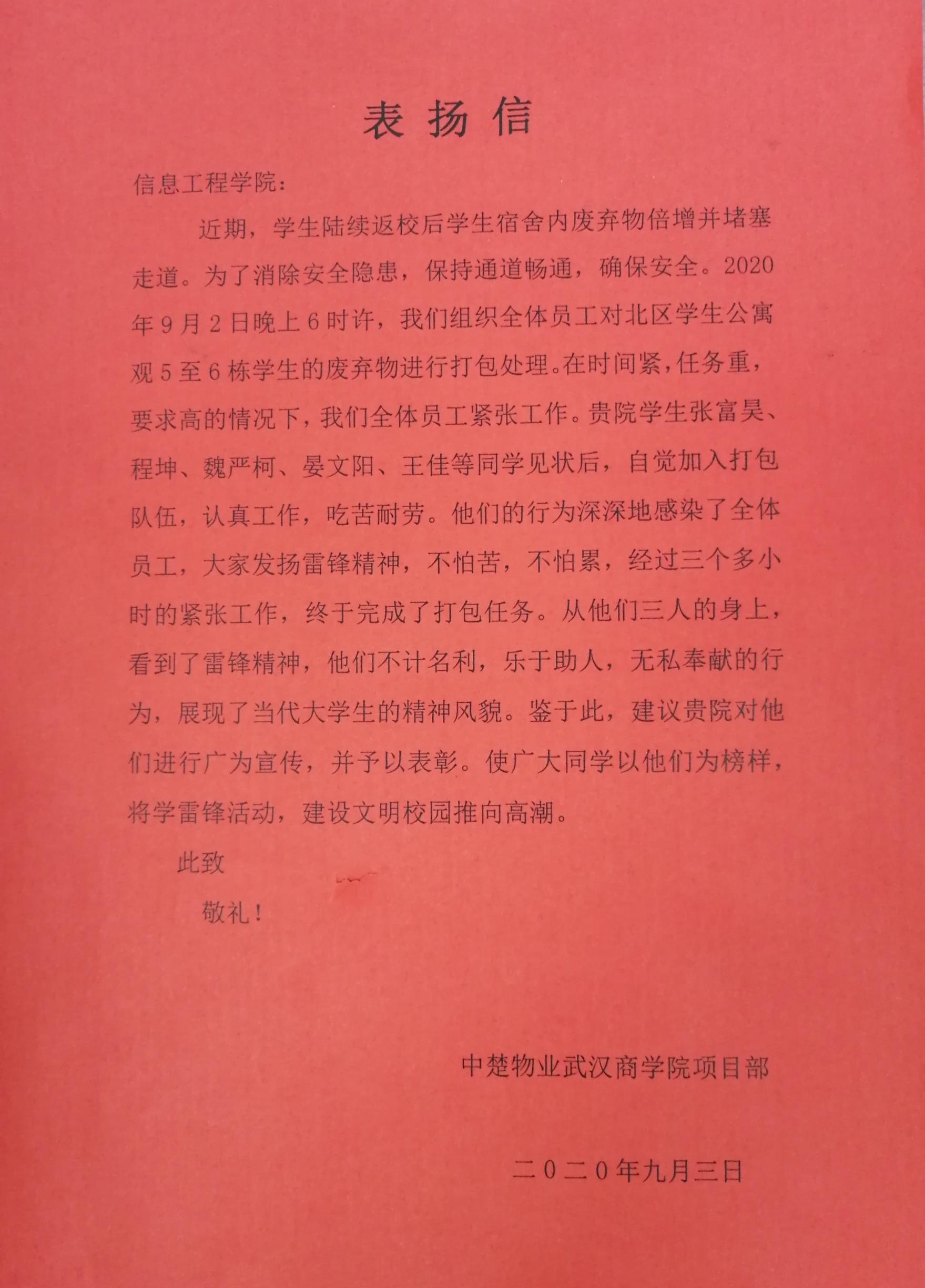 学生返校后学生宿舍内废弃物大量增加。为了消除消防安全隐患,保持通道畅通,2020年9月2日晚上6时许,我们组织全体员工对北区学生公寓观5至6栋内学生废弃物品进行打包,准备清理清运到楼下去。在时间紧,任务重,要求高的情况下,我们全体员工紧张工作。贵院学生张富昊、程坤、魏严柯、晏文阳、王佳等同学见状后,自觉加入打包队伍,认真工作,吃苦耐劳。他们的行为深深地感染了全体员工,大家发扬雷锋精神,不怕苦,不怕累,经过三个多小时的紧张工作,终于完成了打包任务,目前所有废弃物已运至楼外。