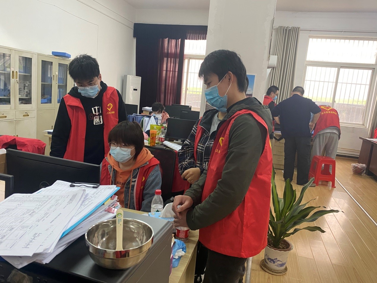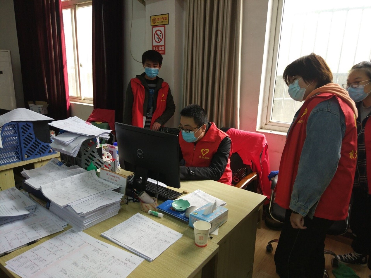 黄雅晶老师带领3名学生值守永久社区东门门岗,负责为进出门岗的行人和车辆司机测量体温,并对外卖员和快递员进行信息登记。