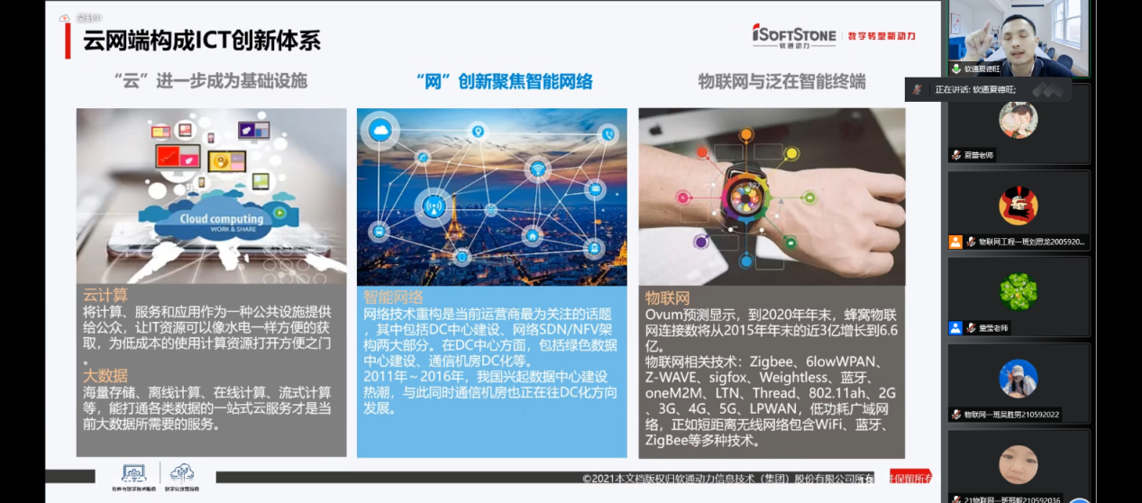 本次实训的主题为“认知ICT行业,迎接新挑战”。实训系统介绍了新一代信息技术的发展,5G时代的书洪流与物联网技术,云计算、大数据和人工智能,鸿蒙生态介绍&发展趋势,鸿蒙经典案例分享及学习方法建议等内容。通过实训,学生们对专业中的核心概念,当前主流的开发技术及其体系架构,鸿蒙生态和具体开发案例建立了一个全面的认知。企业专家还分享了自己的学习方法,并给参与实训的学生们指明了学习方向:在大学四年学习过程中,一年级要确认职业目标,二年级锻炼职业基本技能,三年级加强工程应用能力,四年级通过企业工程实践、顶岗实习、毕业设计等环节最终成为标准职业人。这些建议为参训学生日后的学习规划提供了良好的指引,获得了学生一致的好评。