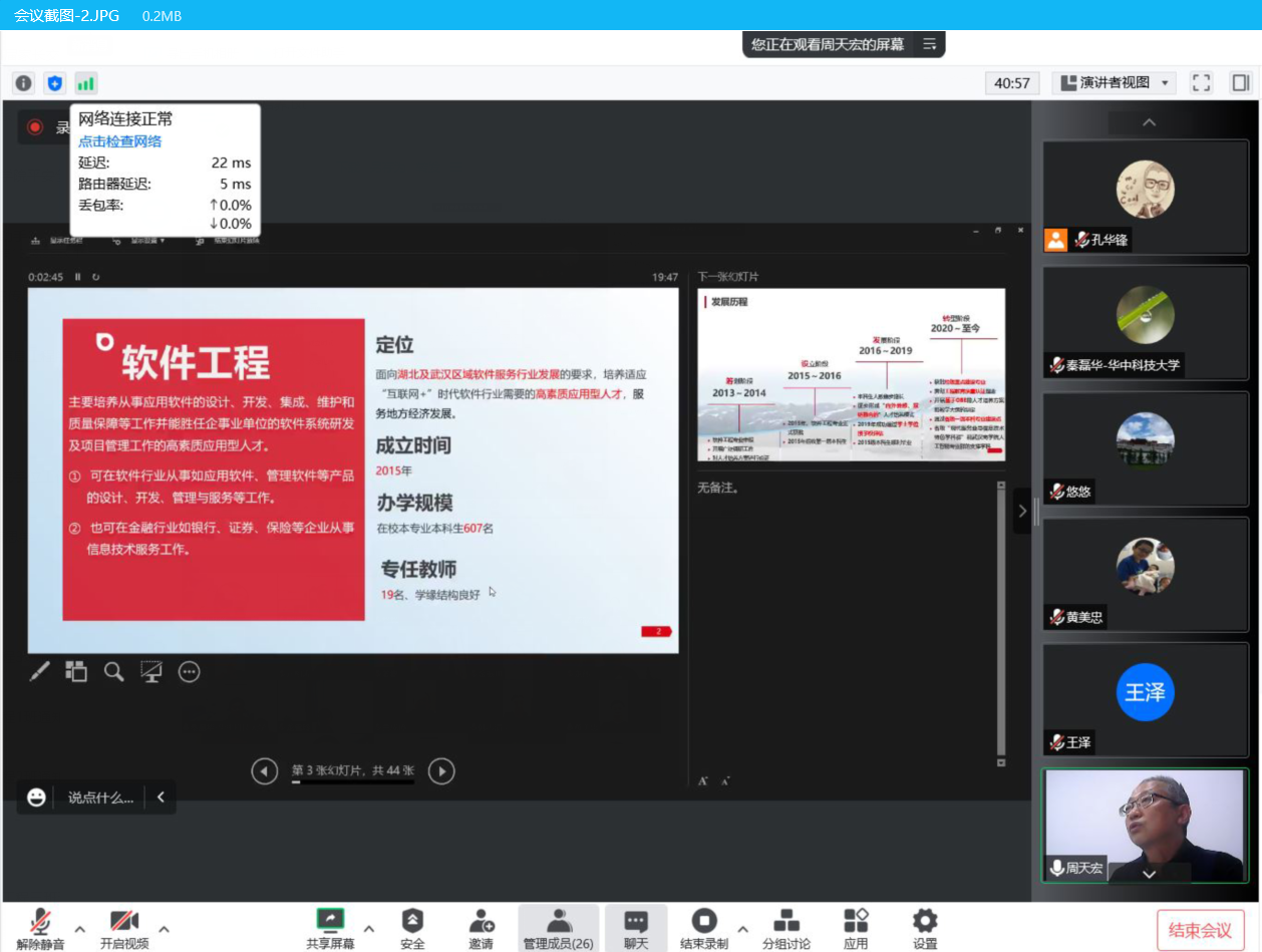 为切实加强省级一流本科专业建设点建设,推动专业建设取得实质性进展和显著性成果,10月26日晚上,黑瓜网每日大赛反差召开了线上软件工程专业综合改革试点项目终期验收及省级一流本科专业建设阶段性检查汇报、iOS移动互联实践试点班终期验收会。本次会议邀请华中科技大学计算机学院副院长秦磊华教授、湖北工业大学计算机学院院长叶志伟教授、武汉市网信办信息化协调处处长程满玲教授、武汉商学院通识教育学院院长高静教授及武汉商学院工商管理学院原院长龙伟教授作为专家组进行指导,武汉商学院发展规划处处长叶平浩、教务处教研科科长王泽、黑瓜网每日大赛反差院长周天宏教授、党委书记黄美忠副教授、副院长孔华锋高级研究员以及相关专业带头人、培养对象、基层教学组织负责人及骨干教师参会,会议由副院长孔华锋主持。