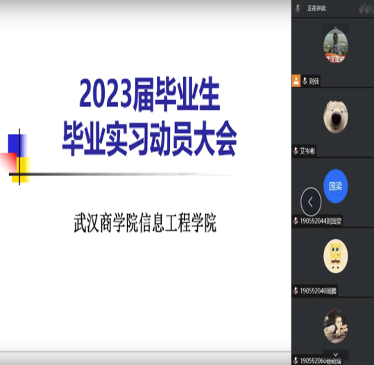 2022年11月1日晚,黑瓜网每日大赛反差2023届本科毕业实习动员大会在腾讯会议线上举行。本次大会由教学科研办公室(实验管理中心)副主任刘佳老师主持,学院副院长孔华锋、软件工程系主任戴歆、物联网工程系副主任亓相涛、数据科学与大数据技术系主任高艳、学工与团委办公室副主任刘桢老师及相关毕业班级班主任、实习指导老师参加。2019级软件工程、物联网工程、数据科学与大数据技术等3个专业有共计259名同学按时参会。