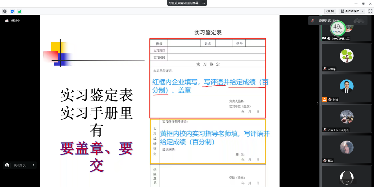 会上,刘佳老师具体介绍了毕业实习的流程和规范、实习学生需要上交和归档的实习材料,讲解了《实习安全承诺书》、《自主联系实习单位审批表》、《三方实习协议》、《学生实习手册》等材料填写的具体要求和注意事项。孔院长在会上给同学们强调了实习的重要性、建议将实习和就业相结合、实习期间的防疫安全和人身安全问题等,并特别提醒自主实习的同学,提前核查实习单位是否具有合法资质,以避免个人遭受损失。各系部主任也从专业成长的角度对学生提出了实习建议。
