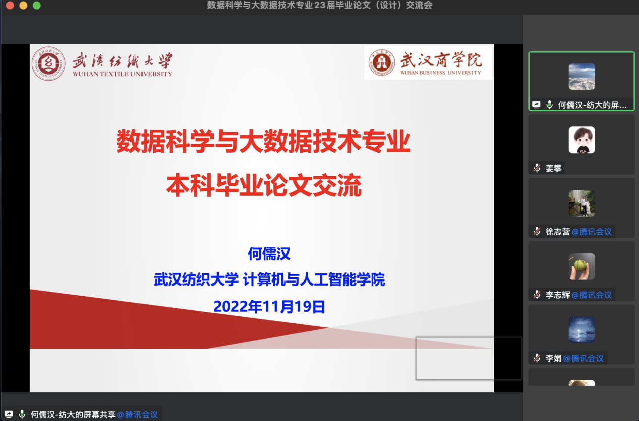 20221119日晚数据科学系利用腾讯会议成功举行数据科学与大数据技术专业2023届本科毕业设计论文交流会受邀参加交流会进行交流的专家是武汉纺织大学计算机与人工智能学院何儒汉教授何教授结合武汉纺织大学计算机与人工智能学院数据科学与大数据技术专业毕业设计论文实际情况从重要性要求纺大情况和问题与未来等四个方面进行了全面深入的交流