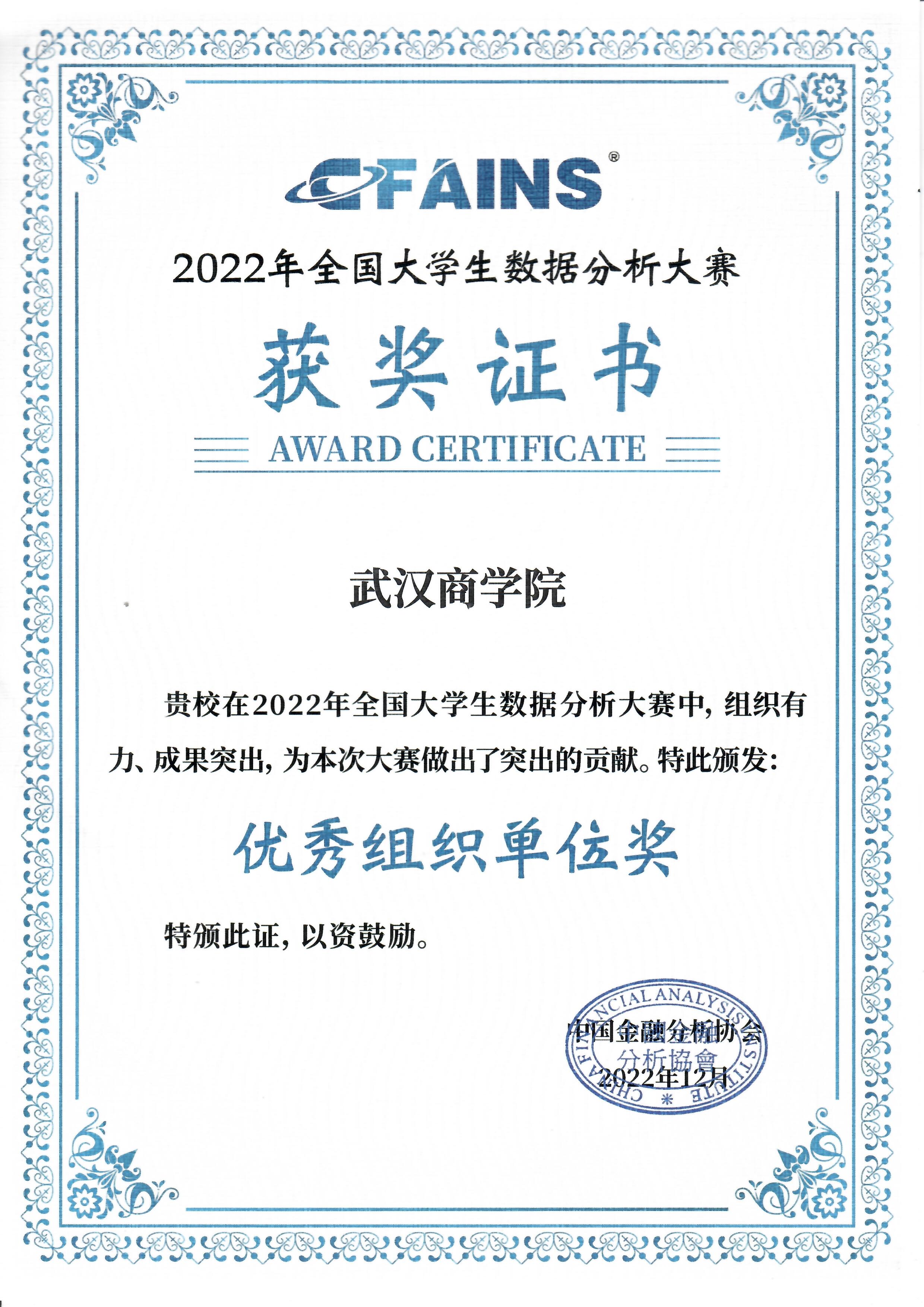 同时,姜攀、沈青和毋世晓等老师获得2022年全国大学生数据分析大赛优秀指导老师奖,武汉商学院获得优秀组织单位奖。