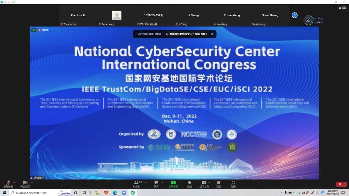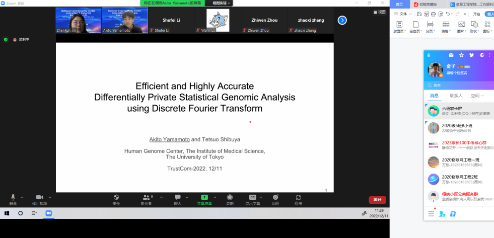 金老师受邀参加TrustCom2022的两个单元,并担任Session Chair,与来自5个国家的论文作者借助Zoom平台共同讨论学习。参与这次国际学术论坛,对于专业老师打开视野,了解学术前沿有着非常重要的意义,很大程度上扩展了老师的研究思路,对后续科研方向的调整和指导学生等工作有极大的帮助。