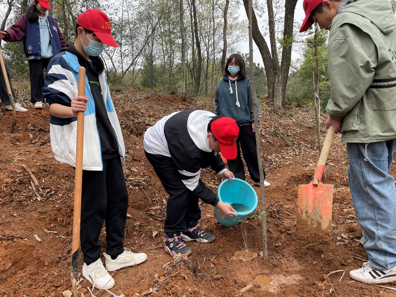 在林场管理员高师傅的指导下,同学们迅速掌握植树技巧,自发分组进行挖坑、埋土、浇水、挂牌等步骤,同学们一一与亲自载下的树苗合影留念,共种植30余棵。