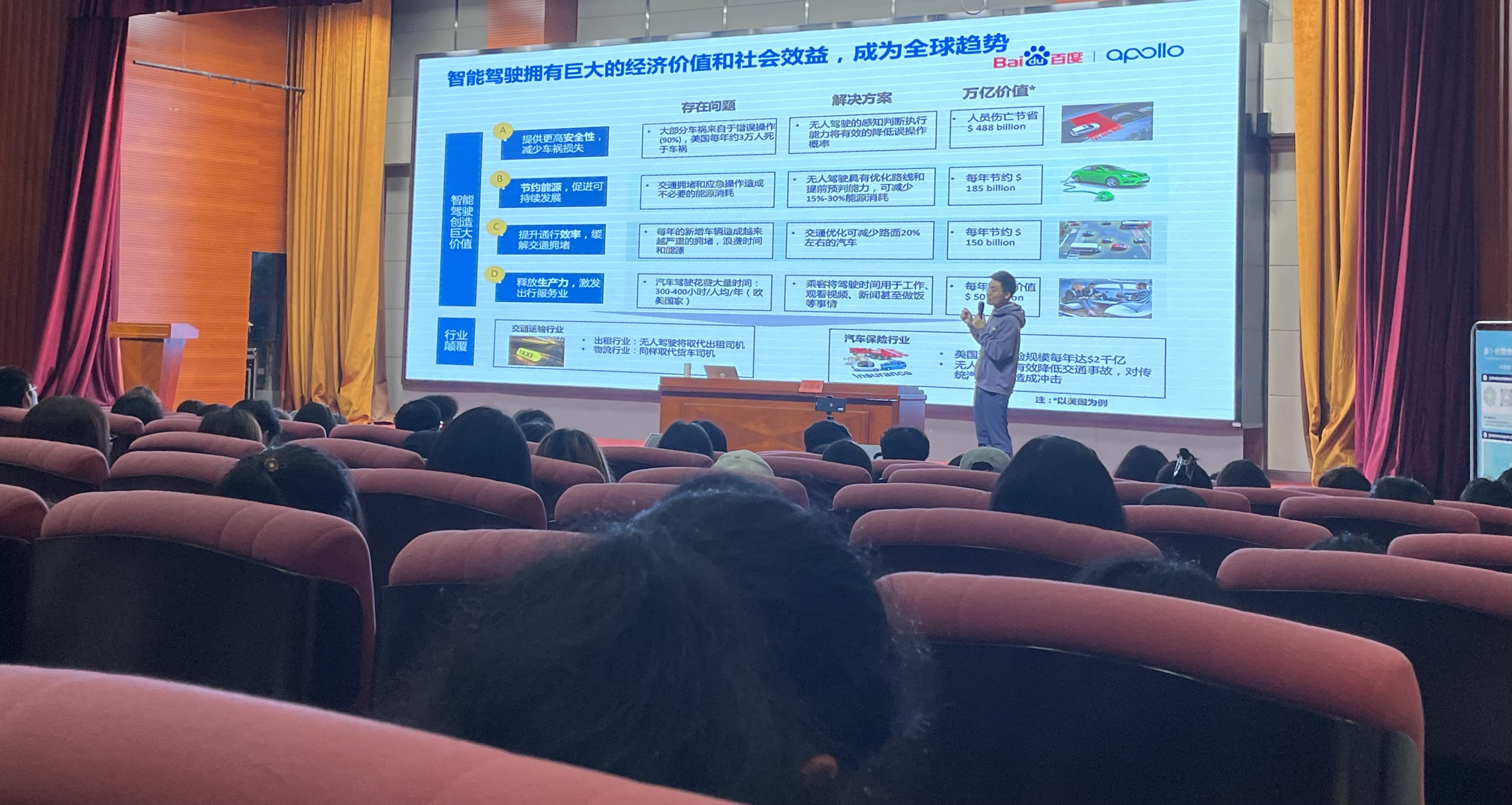 晚上在图书馆报告厅22级全体学生参加了由百度IDG高级人才生态经理季清爽带来的主题为《车路智行、AI创未来》的致远讲坛,通过百度产业实践视角,阶段性、系统性地汇报下自动驾驶理论、技术、商业化进程等,带领同学们了解了百度自动驾驶能力和最前沿的产业实践案例。