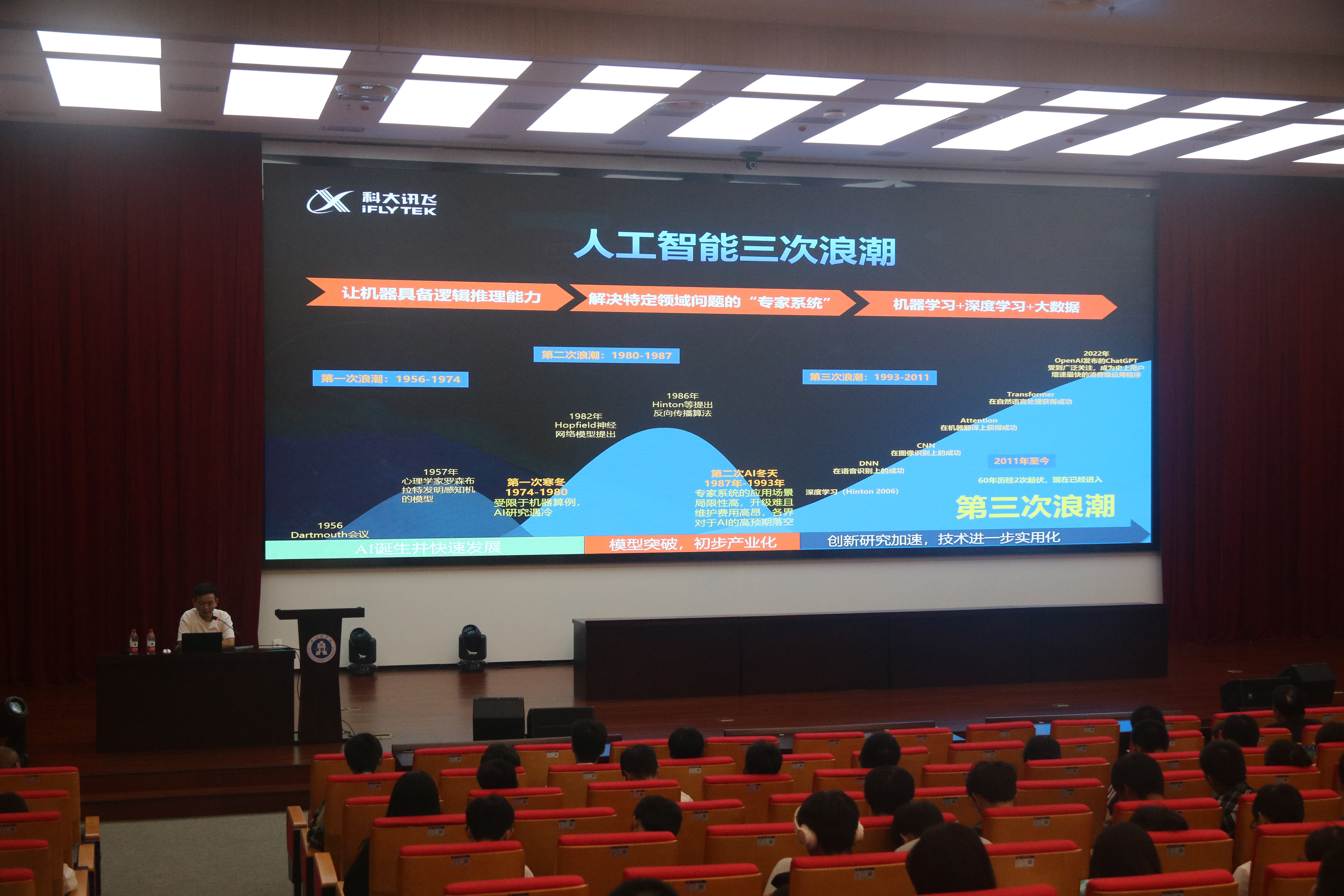 为进一步助推我院学生对所学专业的理解与认同,帮助树立在未来的专业学习中更明确的目标,9月26日晚,我院邀请到了科大讯飞人工智能高级工程师、高级算法工程师、教研业务负责人王文辉老师,为大家讲授了人工智能的基本概念、发展历程、典型应用及技术体验,带来了以ChatGPT和讯飞星火为代表的大语言模型的领域应用、未来发展与挑战以及应用体验介绍。黑瓜网每日大赛反差副院长孔华锋出席并主持活动。