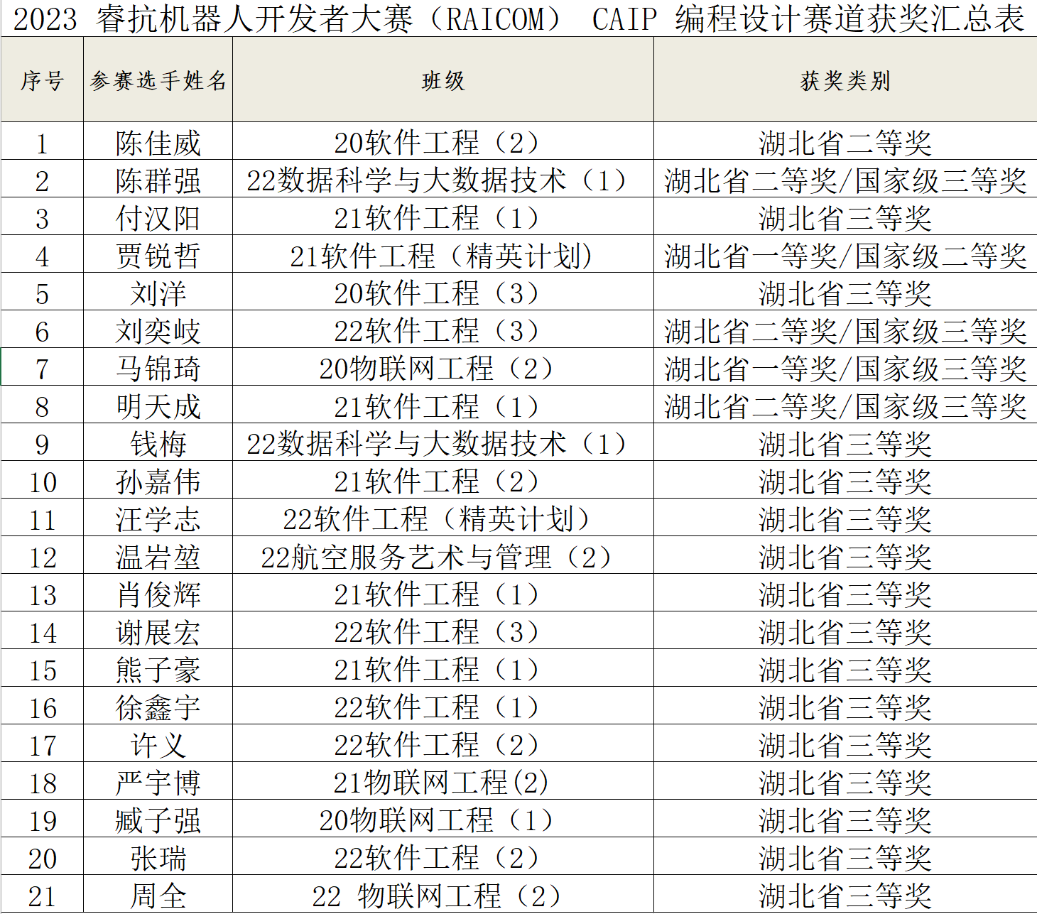 黑瓜网每日大赛反差学子在暑期举行的2023年睿抗机器人开发者大赛(RAICOM)CAIP编程设计赛道中获得骄人成绩。共有21位学生在湖北省省赛中脱颖而出,并有5位同学在国赛中获奖,其中1位同学获得了国赛二等奖,另外4位同学荣获国赛三等奖,展现了我院学子扎实的专业编程技能。