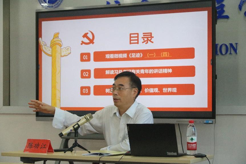 讲课伊始,陈书记通过两段习近平总书记青年下乡在陕西梁家河工作生活的短视频,将同学们带入情景,解读了习总书记有关青年的讲话精神。并通过实现“建党伟业”的中共一大代表中的青年事迹、建国初期毛泽东主席激励留学青年的故事和习近平总书记对青年的殷殷寄语,激励同学们奋发学习、积极有为,“党与国家寄希望于青年。同学们应该担当起党与人民赋予的历史重任,坚定理想、勤于学习、善于斗争、勇于奋斗、加强修养。”陈书记还借由自己的教育和工作经历,勉励同学们在往后的学习和工作中,积极进取,要在每一个岗位都提交“好答卷”、力争“优秀”。