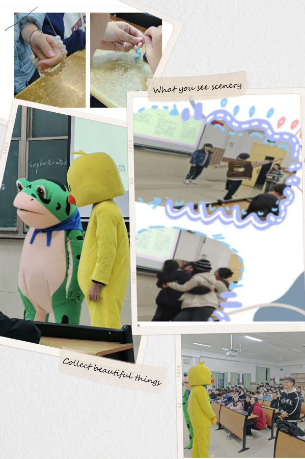 互动实践环节包括情景剧表演、互动游戏和编手链活动。心协会长严庆荣和成员李江鹏以情景剧的形式,模拟大学生活中常见的人际交往场景,让同学们在轻松诙谐中学习人际交往技巧;在互动游戏“爱的抱抱”“猴子上树”中,大家互相帮助、互相鼓励,现场欢笑连连;“心灵手巧”编手链活动深受好评,既考验耐心和专注力,也是个人情感、个性审美的表达,看着亲手编织的一条条美丽的手链,大家享受着喜悦和成就感。