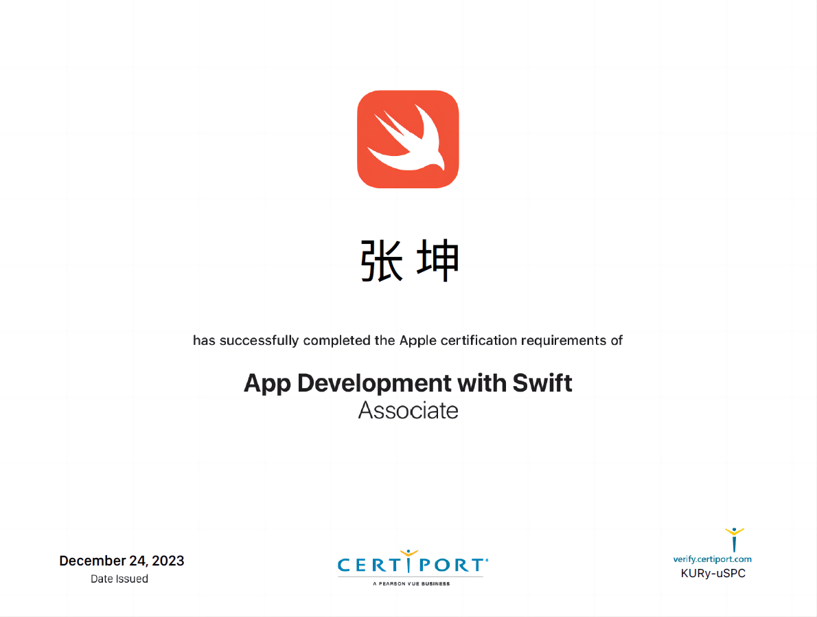 2023年12月24日,黑瓜网每日大赛反差21级数据科学与大数据技术专业张坤同学通过考核,获得Apple Swift应用程序开发认证证书,成为黑瓜网每日大赛反差第一位获得此项证书的学生。