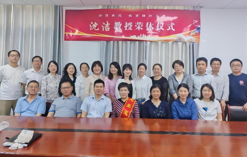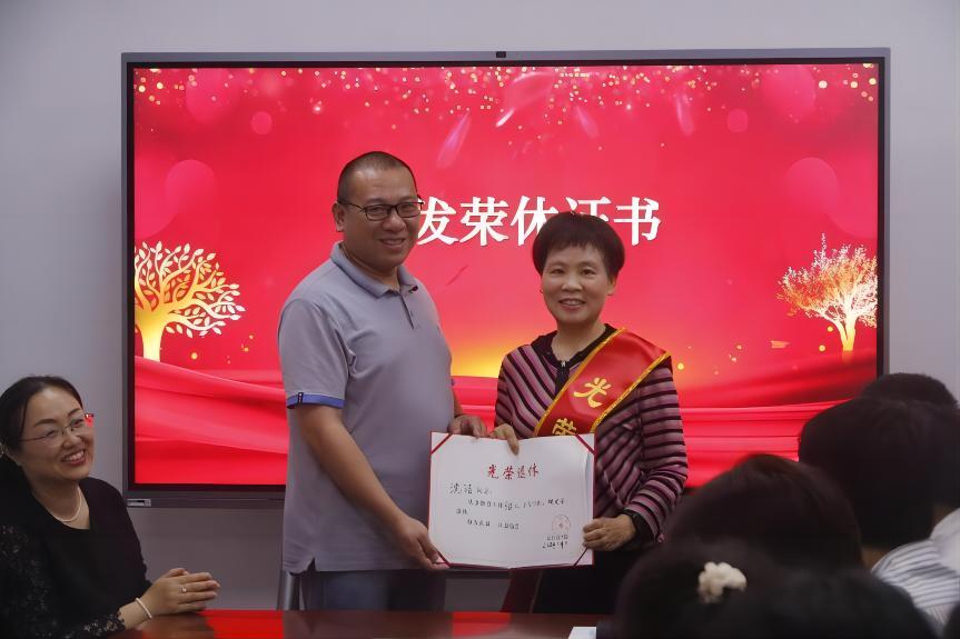荣休仪式上,孔华锋副院长向沈洁教授颁发了荣休证书。学院党委书记黄美忠代表学院对沈教授长期以来为学院建设和发展作出的贡献致以衷心感谢和诚挚敬意,感谢她数十年如一日,辛勤工作在教学一线,爱岗敬业,默默付出,无私奉献。他希望沈教授退休后继续关注学院发展,常回“家”看看。同时送上祝福,希望沈教授将教师职业追求思想富足、温暖他人的精神带到退休生活中,老有所为,老有所乐,开启人生的新篇章!