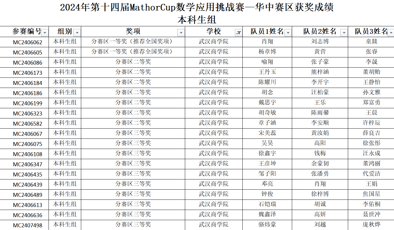 第十四届MathorCup数学应用挑战赛华中赛区获奖名单已公布,我校学子再创佳绩。本次挑战赛共19支队伍获奖,其中赛区一等奖2项(推荐全国奖项),二等奖7项,三等奖10项。具体获奖名单如下表。