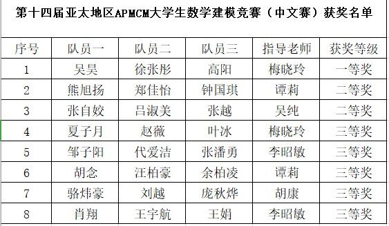 2024年第十四届亚太地区大学生数学建模竞赛(中文赛项)是中国国际科技促进会和北京图象图形学学会联合主办的亚太地区大学生学科类竞赛,共有690所高校的6千多名学生报名,提交了2111份作品参赛。此次比赛。我校共8支队伍获奖,其中一等奖1项,二等奖2项,三等奖5项。该项竞赛已具有较高的国际影响力,在国内高校中不仅常被作为国赛的热身赛来练兵,也是很多学校学生保研加分、评优综合测评加分、创新奖学金评定等的参考业绩之一。