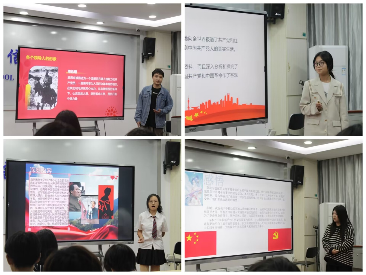 第一位主讲人赵丹同学,她的分享要言不烦,字里行间展现出作为一名读者对于一本书籍的赞美;第二位主讲人饶晔同学,她以谦逊内敛的姿态,以多个方向来解读《红星照耀中国》,让观众随着她的视角,走进这本书。第三位主讲人来自软工精英班的舒城都同学,他用视频来展现当今外国人对中国的理解,自然过渡到书中,他的分享幽默风趣,分享了自己读书时留下深刻印象的部分和对里面人物的欣赏,言语间都展现出自己独特的理解。第四位主讲人,来自大数据(1)班的丁咏一同学,用视频引入书的介绍,她从多角度介绍书中内容,她的分享长而不冗,抒发自己感悟的同时将情怀升华至家国。