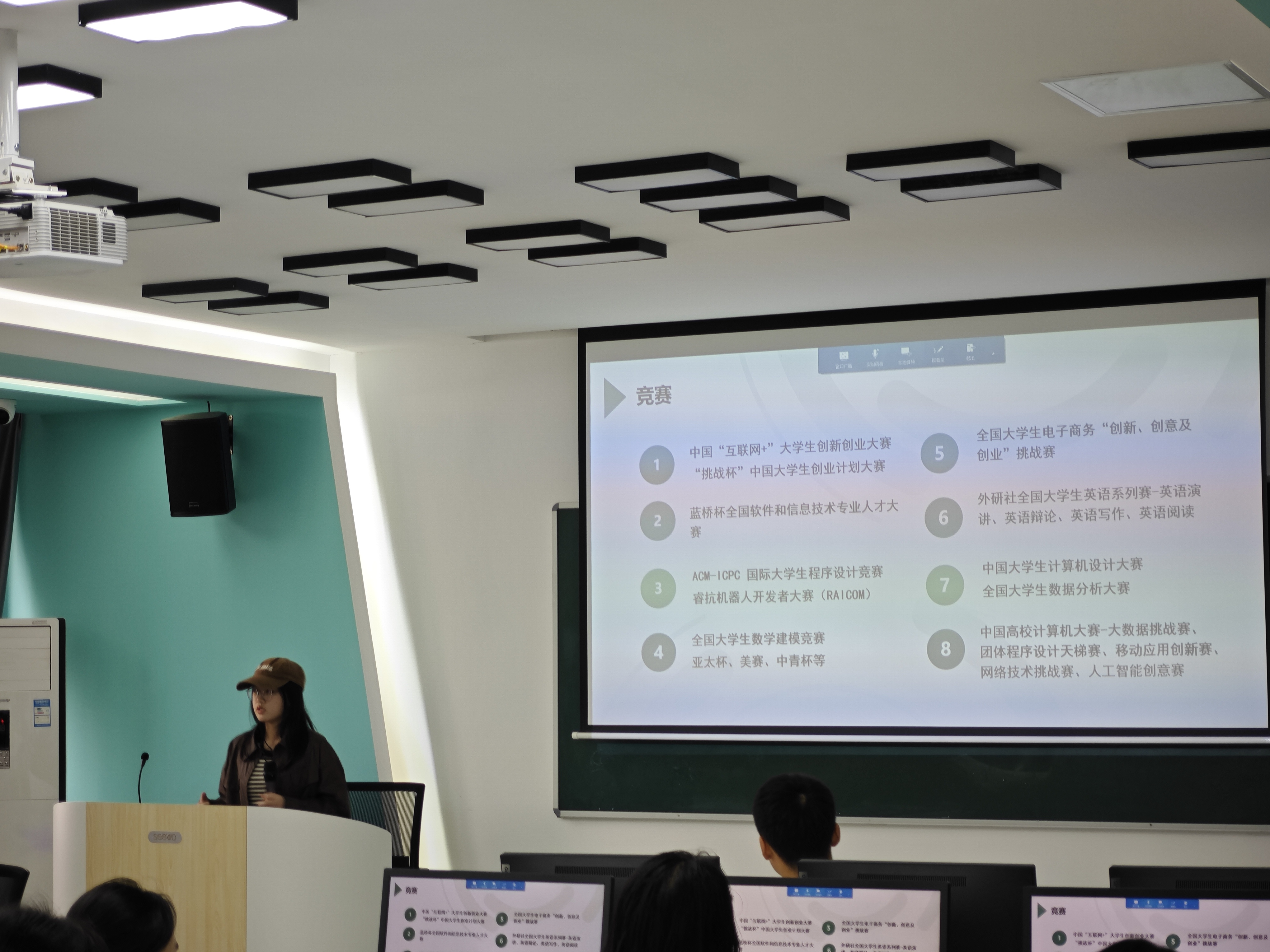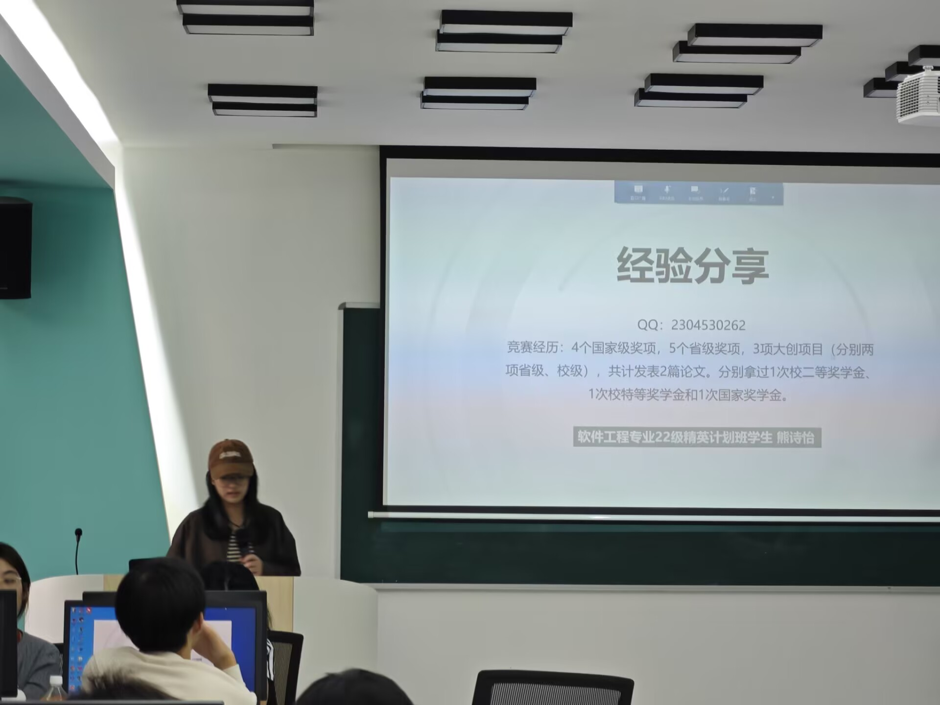 分享会首先由熊诗怡学姐上台做分享。她凭借卓越的学术表现和丰富的实践经历,赢得了在场同学们的阵阵掌声。熊诗怡学姐详细介绍了自己的获奖经历,包括4个国家级奖项、5个省级奖项以及3项大创项目。此外,她还发表了两篇学术论文,并分别获得过校级二等奖学金、校特等奖学金以及国家奖学金。在分享中,熊诗怡学姐不仅展示了自己的学术成果,还向大家推荐了一些热门赛事,鼓励大家积极参与,提升自己的综合素质。