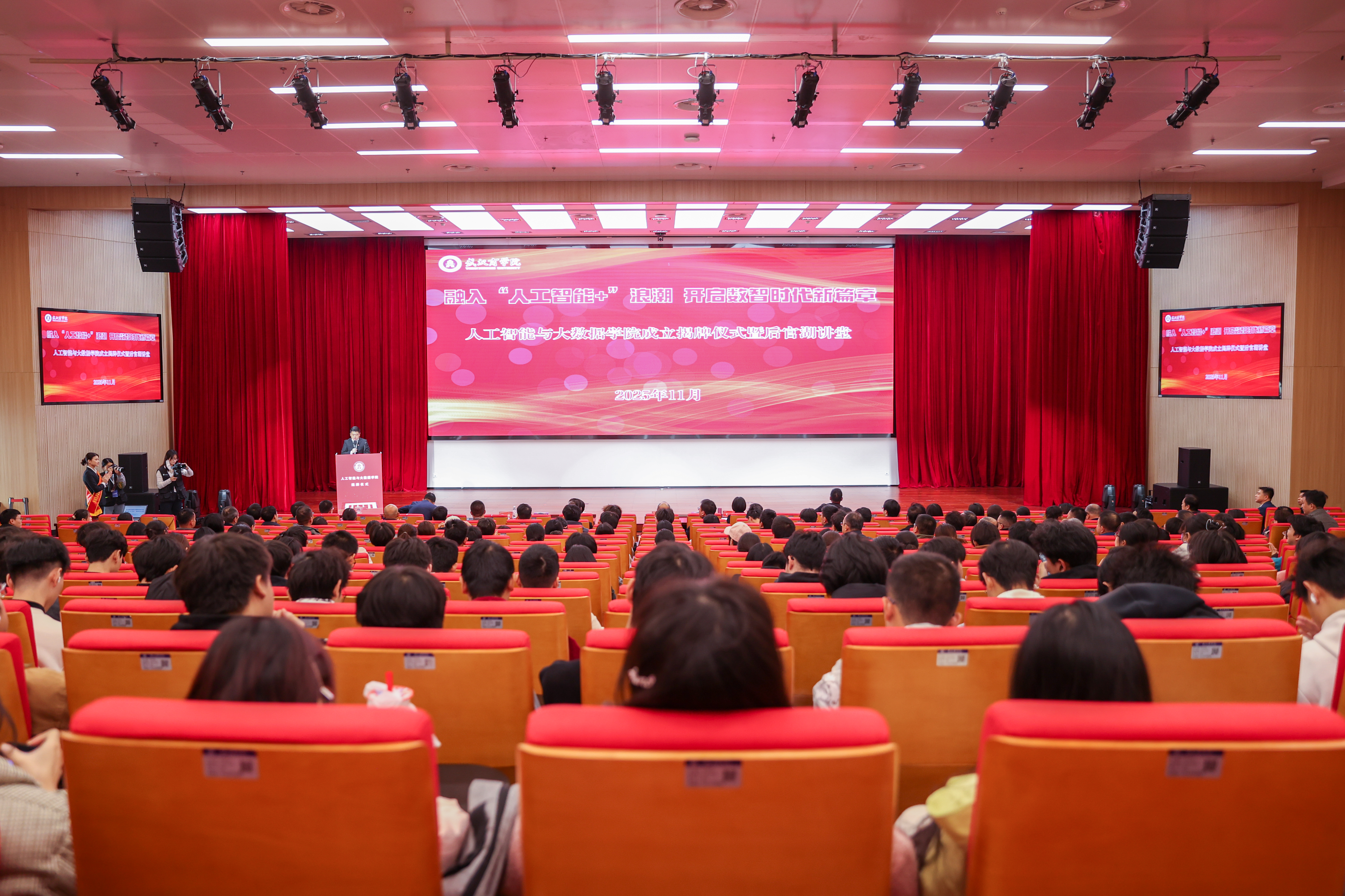 本网讯 11月25日下午,人工智能与大数据学院揭牌仪式在南区大学生中心举行。武汉市数据局局长王烁,全体在校校领导,相关学院、职能部门负责人及各知名企业代表出席,500余名师生代表共同见证了这一重要时刻。本次揭牌仪式由副校长陈磊主持。