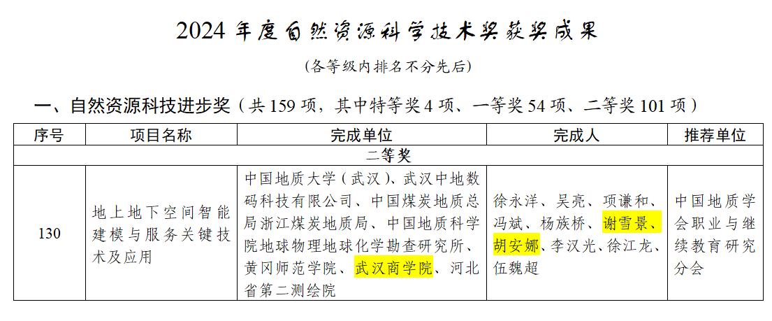 近日,自然资源部发布了2024年度自然资源科学技术奖获奖成果,我校作为参与单位获得自然资源科学技术奖一项。