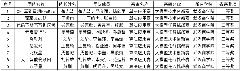 2025年11月,武汉商学院人工智能与大数据学院学生在2025年第七届全球校园人工智能算法精英大赛算法应用赛道省赛中喜获佳绩,共获得省赛奖项9项,其中一等奖1项、二等奖6项、三等奖2项,总成绩在同类参赛院校中表现突出。