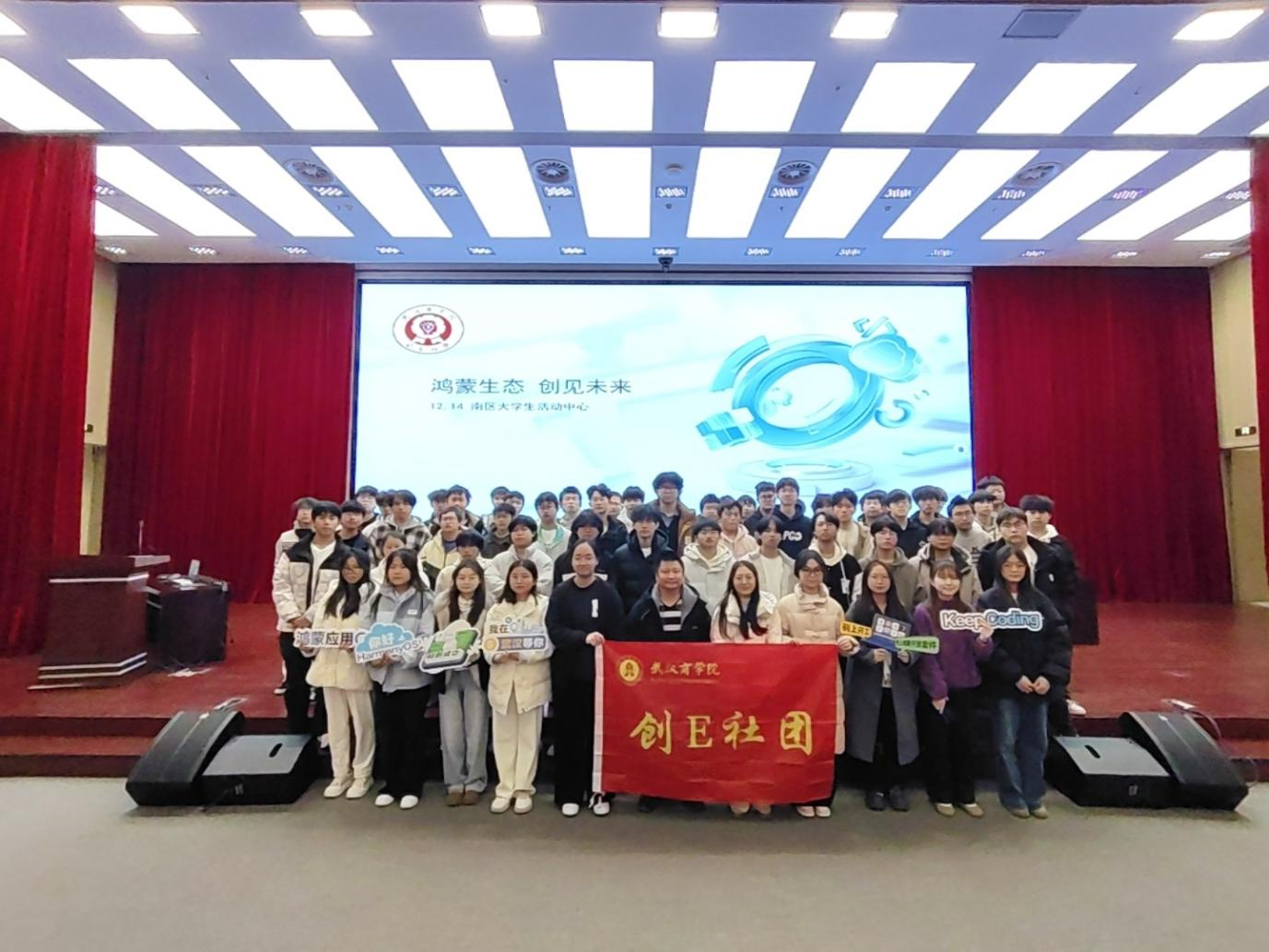 2025年12 月 14 日,由人工智能与大数据学院承办、创E社团协办的 HDD?鸿蒙赋能交流会(武汉站)在南区大学生活动中心成功举办。本次活动聚焦 HarmonyOS NEXT 核心技术生态,汇聚行业顶尖专家与优秀企业代表,为在校学子搭建了技术交流、实践赋能的高端平台,助力同学们把握国产操作系统产业升级新机遇,深度解锁鸿蒙开发的核心奥秘。